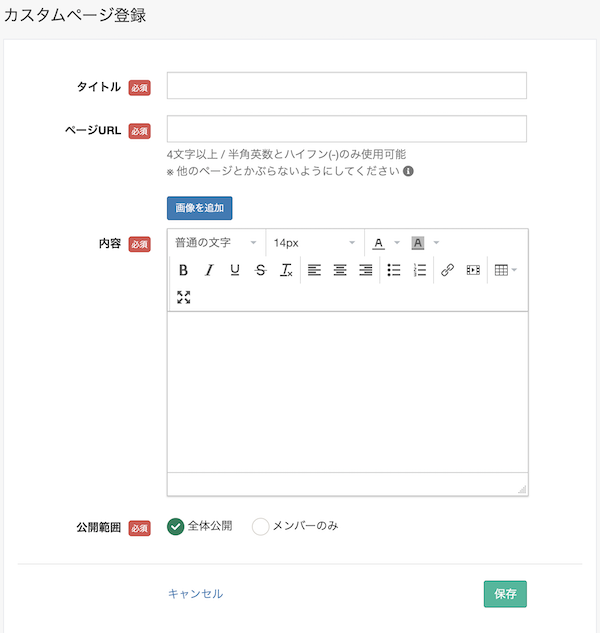 また、「detail」や「member」など、一部のURLはシステム側で使用しているため登録できません。(詳しくはカスタムページ登録画面のヘルプをご覧ください)